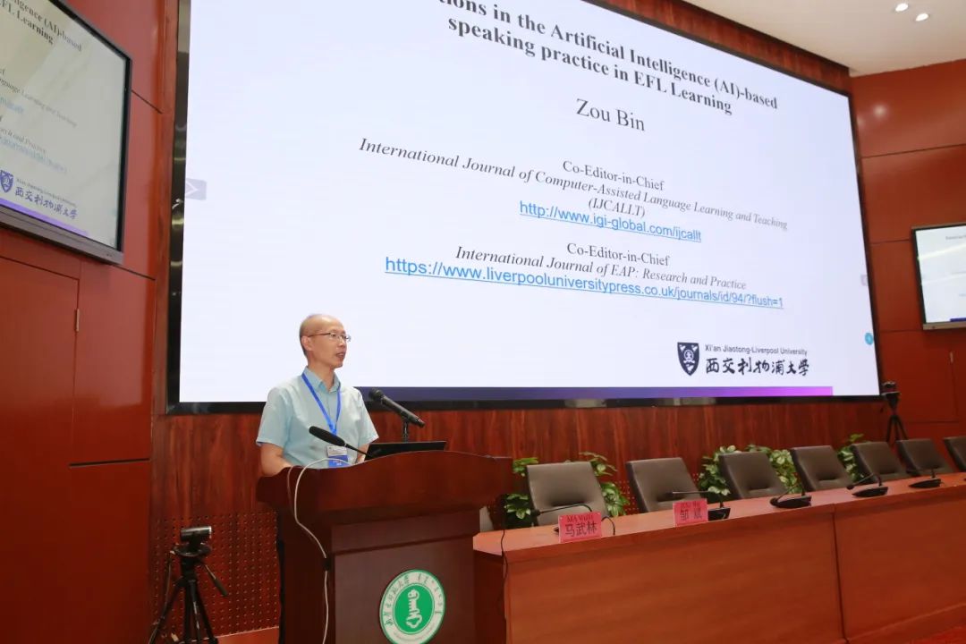 西交利物浦大学邹斌博士的主旨报告为“Interactions in the Artificial Intelligence (AI)-based Speaking Practice in EFL Learning(基于人工智能技术的口语练习在外语学习中的交互作用)”,探讨人工智能如何辅助学习者基于社交网络进行人际互动和口语训练,并分享了通过问卷调查、访谈和测试等方法得出的研究结果,证实了学习者在智能环境中的口语能力提升有效性,并对未来研究提出相应建议。