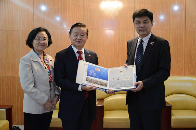 杨伟国向母校捐赠了巴勒斯坦总统授予他的耶路撒冷之星勋章及证书、巴勒斯坦总统阿巴斯金质奖章,国书副本、杨伟国大使纪念邮票、毕业证书等珍贵实物和《见证巴勒斯坦》《中国驻中东大使话中东:巴林》等个人著作。赵刚代表学校向杨伟国表示感谢,为其颁发捐赠证书,并赠送了校庆80周年纪念邮册和阿语版《老子》《孟子》。