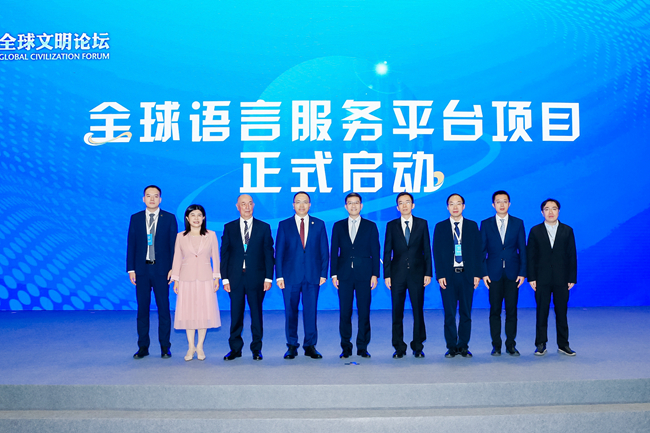 全球语言服务平台是北外“十四五”建设规划的重点项目,包含语言服务平台、语言教育平台、语言研究与保护平台等三个子平台,以“解决语言服务的供需匹配”为目标,以专业、精准、智能服务为特色,致力于构建国家、企业、高校、社会协作共建的语言服务生态,对服务“一带一路”建设、推动构建人类命运共同体意义重大。张伟武、孙明春、杨丹、于运全,阿塞拜疆语言大学校长顾问贾雷·阿拉维帝耶夫,国家发改委社会发展司人力资源开发处处长翟建民,外研集团党委书记、董事长、外研社社长王芳,中国土木工程集团有限公司经营开发中心副总经理赵骥,阿里云计算有限公司科研智算总经理王为之共同启动全球语言服务平台项目。