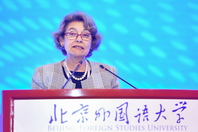 联合国教科文组织前总干事伊琳娜·博科娃在致辞中高度评价了北外立足全球语言、全球文化和全球治理三大领域,培养一流人才、开展高质量科学研究和提高全球声誉方面的努力,赞扬了北外在促进不同文明交流与相互理解中所作的贡献。她认为,当今世界相互依存,任何一个国家都无法独自克服面临的挑战,世界需要集体的知识、努力和承诺共同应对困难。博科娃在讲话中强调了人类命运共同体理念与联合国2030年可持续发展议程的相通之处;阐述了教育,特别是高等教育在塑造青年人和帮助实现可持续发展目标中的重要作用;论述了性别平等对经济和社会进步,实现正义、包容的重大影响。博科娃表示,联合国和其他新兴多边机构需要有能力、有知识,秉承人道主义理念、尊重文化多样性,能够通过外交、谈判等方式解决冲突、促进发展的人才,相信北外的学生必将参与其中。