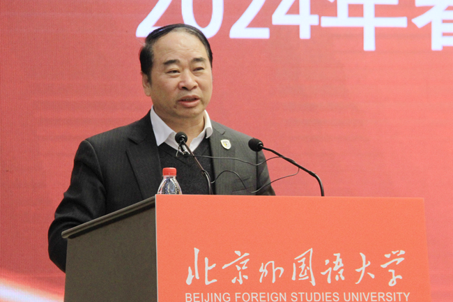 王定华深刻分析了当前国际国内形势,深入阐述了北外当前面临的机遇与挑战,他指出,2024年是新中国成立75周年,是实现“十四五”规划目标任务的关键一年,也是学校事业发展历程中重要的一年。环顾世界,百年未有之大变局加速演变,人工智能为代表的全球教育竞争和科技发展竞争日趋激烈,教育发展面临前所未有的新机遇新挑战。回望国内,教育强国建设的蓝图已经绘就,高校间的竞争也日趋白热化、透明化。聚焦北外,我们必须以习近平总书记给北外老教授们的重要回信精神为指引,积极应对国内外竞争新态势,增强战略思维和大局意识,跳出教育看教育,立足中国办教育,跳出北外看教育,与时俱进、解放思想、更新手段、付诸行动,以时不我待、舍我其谁的奋进姿态迎接挑战,以攻坚克难、砥砺前行的奋斗精神开辟未来。