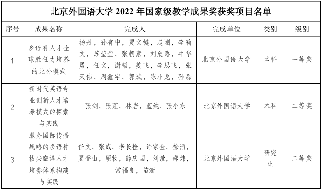 2023年7月,教育部公布2022年高等教育国家级教学成果奖获奖名单,北外3项成果荣获高等教育国家级教学成果奖,其中《多语种人才全球胜任力培养的北外模式》荣获2022年高等教育(本科)国家级教学成果奖一等奖,《新时代英语专业创新人才培养模式的探索与实践》荣获2022年高等教育(本科)国家级教学成果奖二等奖,《服务国际传播战略的多语种拔尖翻译人才培养体系构建与实践》荣获2022年高等教育(研究生)国家级教学成果二等奖,获奖等级和数量均实现新突破。