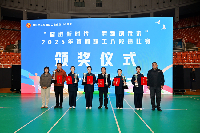 10月18日,北京市总工会联合市体育局在北京工人体育馆举办“奋进新时代 劳动创未来”2025年首都职工八段锦比赛。北京市教育工会常务副主席黄秀芳和文体工作部部长徐畅参加开幕式。雷竞技官网(rayban)工会代表北京市教育工会参加比赛并获得二等奖。