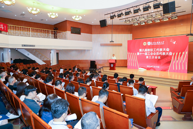 丁浩作了题为《凝心聚力、砥砺前行,充分发挥教职工主人翁作用,为学校事业高质量发展团结奋斗》的工会工作报告。他表示,在学校党委和上级工会的正确领导下,校工会以习近平新时代中国特色社会主义思想为指导,认真学习贯彻党的二十大精神,习近平总书记关于工人阶级和工会工作的重要论述,中国工会第十八次全国代表大会精神,深入开展党纪学习教育,紧紧围绕学校中心工作,积极创建“人文、智慧、务实、创新”工会,围绕为教职工办“十件实事”,强化“一社一品”社团建设,办好第二届体育文化节,搭好“青教赛”“青管赛”竞技场等重点工作,有力推动教职工建功立业。2023年校工会获得“全国教科文卫体系统模范之家”称号、北京高校第十三届青教赛和第二届青管赛突出贡献奖和优秀组织奖,工作成效显著。今后,校工会将不断增强工会的政治性、先进性和群众性,继续发挥桥梁纽带作用,凝心聚力、担当作为、优化服务,团结带领广大教职工为学校“双一流”建设作出更大贡献。