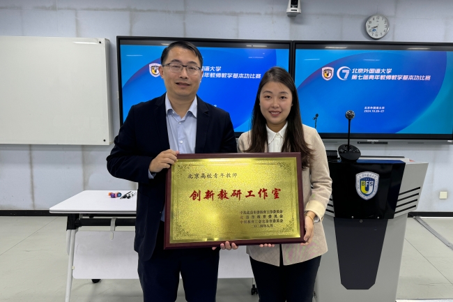 开幕式上,丁浩为北京高校青年教师创新教研工作室授牌,北京高校第十三届青年教师教学基本功比赛文科A组一等奖获得者、中国语言文学学院教师吴娟作为工作室代表上台领牌。