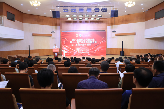 丁浩作了题为《拼搏进取、甘于奉献,充分发挥教职工主力军作用,为学校事业高质量发展不懈奋斗》的工作报告,从聚力理论学习,强化思想引领效能;深耕民主管理,彰显监督有力担当;专注教职工发展,铸就人才成长摇篮;心系职工权益,提升工会服务温度;完善自身建设,激发工会内生动力和点亮文体生活,凝聚教职工向心力等六个方面汇报了工会一年来的成绩。他从三个方面提出推进工会工作高质量发展的举措:一是高水平学习助力高质量发展,持之以恒加强思政和工会理论学习;二是高质量规划引领高质量发展,全面做好工会“十五五”规划调研;三是高标准工作实现高质量发展,用心推动工会重点工作落地见效。