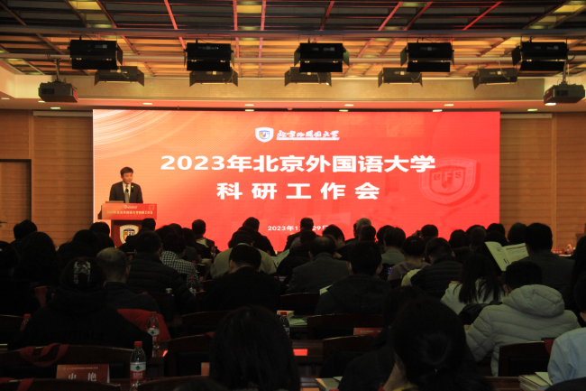 赵刚作总结发言,他提出,在强国建设过程中,建构哲学社会科学自主知识体系是国家之需、时代之需,外语学科作为哲学社会科学的重要组成部分,在构建中国自主知识体系方面承担着重要的时代使命,我们要通过高质量的有组织科研,系统规划、整体推进相关知识领域的创新。希望2024年,北外加强高层次科研项目申报,积极推进高质量、创新型成果的产出,高度重视团队建设,进一步加强平台建设,提高科研服务水平,进一步营造浓厚的学术氛围。