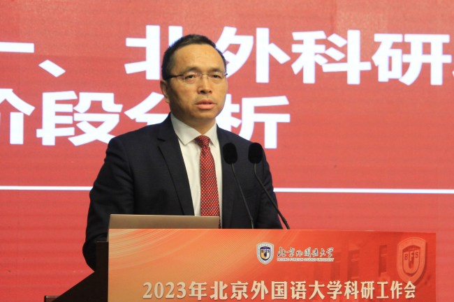 张天伟围绕北外2021-2023年科研工作成效、发展空间和未来举措等方面展开汇报。他表示,三年来,学校在科研项目规划申报、高水平科研机构建设、科研绩效评价改革与优秀成果推介、中外文学术期刊方阵建设和繁荣学术交流等方面取得了一系列成绩。下一步,科研处将在学校党委的领导下,稳扎稳打,切实加强有组织科研,推动自主知识体系创新,服务教育强国建设。