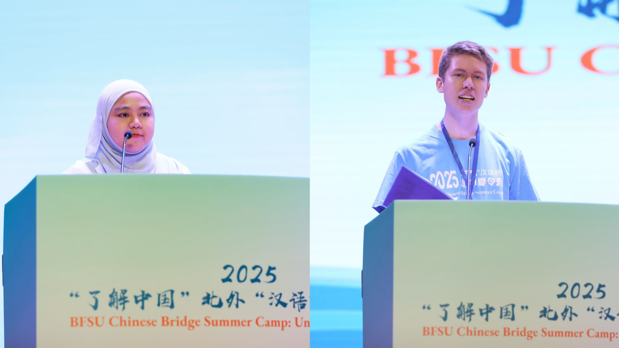 马来亚大学孔子学院中文教师许曼文(NUR AFIFAH BINTI ELIAS)、西班牙巴塞罗那孔子学院学员张鑫宇(Joaquin Espejo Zhang)分别代表带队教师和营员发言。许曼文深情回忆了自己在北外多年的求学经历,分享了以带队教师身份重返母校的自豪与喜悦。她鼓励营员们积极参与各项活动,在学习与体验中增进理解、收获成长。张鑫宇讲述了自己六年的中文学习历程与感悟,表达了对中国历史文化的热爱和对本次夏令营的期待。他希望通过这次夏令营,近距离感受中国文化的独特魅力,结识更多志同道合的朋友,积极参与跨文化交流的各项活动。