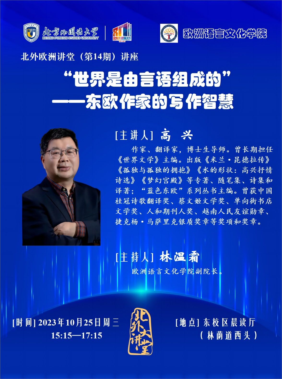 10月25日(周三),《世界文学》杂志原主编高兴将做客“北外欧洲讲堂”,带来讲座《“世界是由言语组成的”——东欧作家的写作智慧》。讲座以“东欧文学”这一概念为切入口,聚焦卡达莱、克拉斯诺霍尔卡伊、乌力卡鲁、希姆博尔斯卡、赫拉巴尔、托卡尔丘克等东欧代表作家及其作品,探寻他们的相同追求、特色和趋向,试图更好理解东欧作家的写作策略和写作智慧。