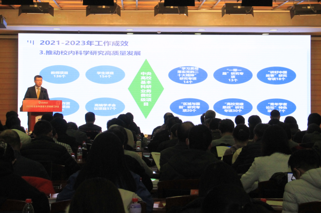 张天伟围绕北外2021-2023年科研工作成效、发展空间和未来举措等方面展开汇报。他表示,三年来,学校在科研项目规划申报、高水平科研机构建设、科研绩效评价改革与优秀成果推介、中外文学术期刊方阵建设和繁荣学术交流等方面取得了一系列成绩。下一步,科研处将在学校党委的领导下,稳扎稳打,切实加强有组织科研,推动自主知识体系创新,服务教育强国建设。