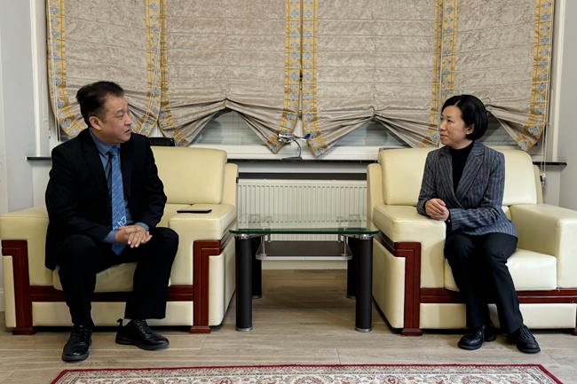 10月28日,代表团一行前往中国驻捷克大使馆,拜会中国驻捷克大使冯飚。胡志钢向冯飚介绍了北外近年来在学科建设、人才培养、国际交流等方面取得的成绩,希望使馆对奥洛穆茨孔子学院建设、北外学生赴捷克交流学习给予指导和帮助,并邀请大使回母校为北外学生开设讲座。冯飚欣然应允,并向代表团通报了中捷关系的最新进展。他表示,北外在促进中捷两国友好交往、民心相通等方面发挥了重要作用,为国家外交事业培养了大批优秀人才,使馆将大力支持建设奥洛穆茨孔子学院,并为北外与捷克高校合作牵线搭桥,为北外学生赴捷克学习提供便利。