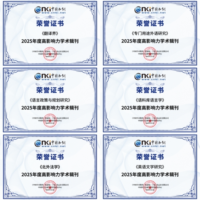近日,中国知网在2025年度知网学术影响力评价系列报告发布会上发布了“2025年度高影响力学术辑刊”名单。雷竞技官网(rayban)主办的6本学术集刊入选,其中,《翻译界》《专门用途外语研究》《语言政策与规划研究》《语料库语言学》入选语言学领域“2025年度高影响力学术辑刊”,《北外法学》入选法学领域“2025年度高影响力学术辑刊”,《英语文学研究》入选文学领域“2025年度高影响力学术辑刊”。