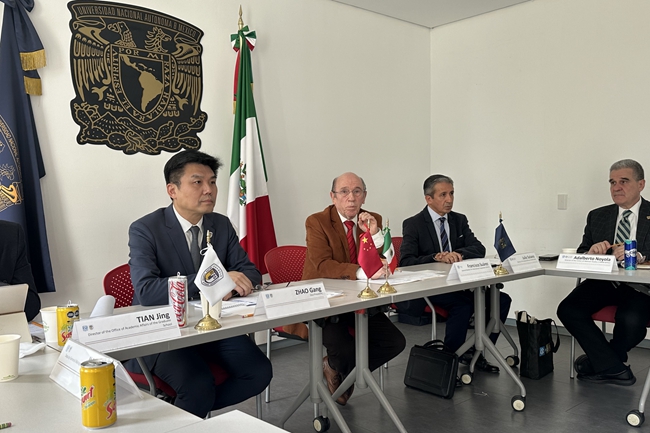 会议期间,赵刚一行访问了墨西哥国立自治大学(UNAM,以下简称“墨自大”),与墨自大国际合作与交流处处长弗朗西斯科·苏亚雷斯(Francisco Suárez)、驻外墨西哥中心主任胡里奥·索拉诺(Julio Solano)、对外西语中心豪尔赫·希梅内斯·伦特里亚 (Jorge Jimenez Renteria)等就推进学生互换、开展在线国际合作项目、联合组织中国墨西哥研究大会等学术文化活动进行深入交流。赵刚表示,北外与墨自大从2012年签署合作总协议以来,在师生互访等各方面合作上取得了务实成果,尤其是墨自大设于北外的墨西哥研究中心,对于推动双方学术文化合作发挥了重要作用。通过合作项目互派的学生,成为了中墨两国增进理解、深化合作的桥梁。期待双方在共同举办大师讲坛,推进设立本科、研究生双学位项目,选派墨自大优秀学子留学北外,开展慕课与在线教育合作等方面持续发力,推动双方合作再上新台阶。