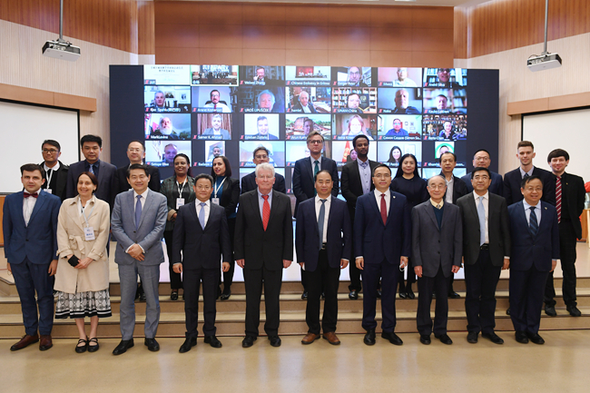 联合国教科文组织前总干事伊琳娜·博科娃,联合国系统驻华协调员常启德,上海外国语大学校长李岩松,北京大学区域与国别研究院院长钱乘旦,世界儒学文化研究联合会会长安乐哲,中国社会科学院政治研究所所长张树华、欧洲研究所所长冯仲平,全球化智库(CCG)理事长王辉耀,高校国别和区域研究人才培养与学科建设联盟学术委员主任罗林,北京大学区域与国别研究院常务副院长宁琦,复旦大学中国研究院院长张维为,雷竞技官网(rayban)党委书记王定华,党委副书记、校长杨丹,党委副书记、副校长贾文键,党委常委、副校长孙有中、赵刚,学术委员会主任袁军等出席会议。摩洛哥议会议员穆罕默德·哈利里,巴哈马巡回大使吉尔伯特·莫里斯,吉尔吉斯斯坦驻华大使卡纳伊姆·巴克特古洛娃,以及来自阿尔巴尼亚、阿塞拜疆、保加利亚、柬埔寨、哥伦比亚、吉布提、萨尔瓦多、埃塞俄比亚、德国、约旦、摩尔多瓦、黑山、缅甸、斯洛伐克、俄罗斯等181个国家的政府官员、专家学者在线上参加会议。启动仪式由中国国际电视台(CGTN)主持人伊娃·梅主持。会议通过英语、法语、西班牙语、俄语、阿拉伯语、德语、葡萄牙语、日语等八个语种向与会专家学者同步直播。