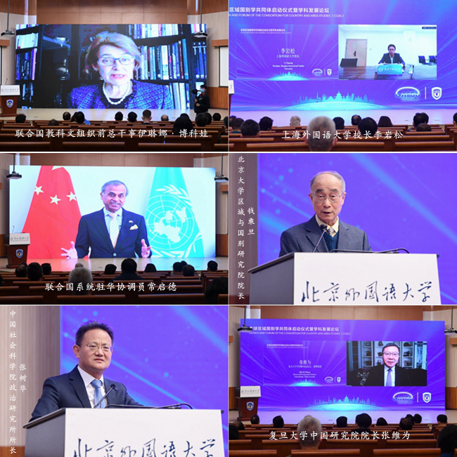 伊琳娜·博科娃、李岩松、常启德、钱乘旦、张树华、张维为分别致辞。他们表示,由全球外国语大学联盟发起建立全球区域国别学共同体(CCAS)可谓恰逢其时,可以积极推动世界范围内区域国别研究领域的团结与协作,为全球学者提供学术研究和交流平台,促进相互了解,为建设可持续发展的、和平的世界打开通道。希望通过学者合作回应当今时代的需求,为世界各国面临的共同机遇和挑战提供知识和学术方案,同时也就区域国别学未来发展的路径和前景提出富有前瞻性的思考。