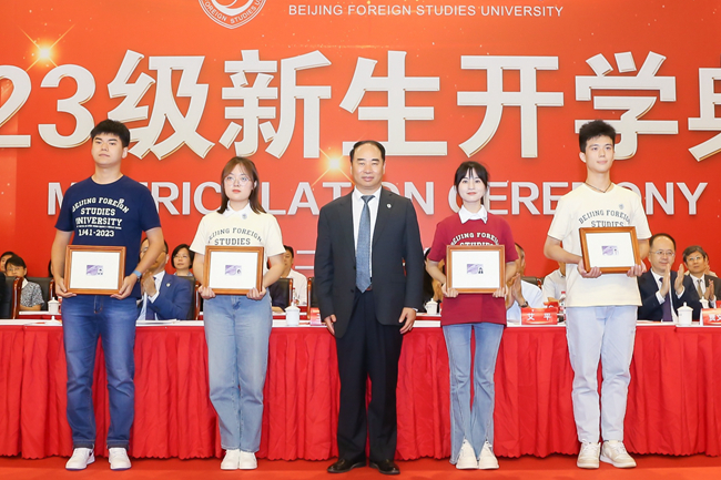 随后,新生代表向在场教师代表鞠躬并敬献鲜花,新生领誓代表带领全体新生宣读入学誓词:铭记兼容并蓄、博学笃行的北外校训,志存高远、勤学力行,敬师爱校、诚以待人,强健体魄、阳光向上,珍惜韶华、奋发有为,胸怀天下、敢于争先,不畏艰难、勇担使命,服务人民、奉献祖国。