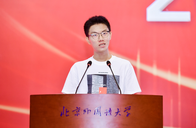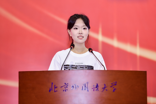 本科新生代表、英语学院的朱耘孜结合自身经历,阐述了对语言传递希望、连接世界的力量,以及北外人传承红色基因、肩负时代使命的思考,号召同学们以“言”打磨语言利刃、以“心”永葆赤子之心、以“行”践行时代使命,以青春之名共担责任,书写北外人的崭新篇章。
