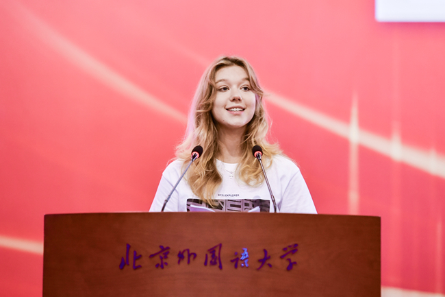 留学生代表、中国语言文学学院本科生、来自俄罗斯的玛丽亚在发言中回顾了学习中文的经历,传递了对汉语与中外友谊的热忱,表达了对汉语承载文明意义的认知,以及在北外深耕学习,以语言为桥促进跨文化交流的期待。