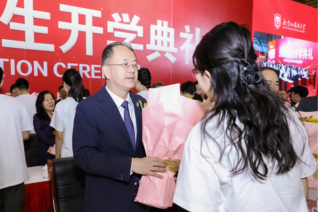 随后,新生代表向在场教师代表敬献鲜花,新生领誓代表带领全体新生宣读入学誓词:铭记“兼容并蓄 博学笃行”的北外校训,志存高远、勤学力行,敬师爱校、诚以待人,强健体魄、阳光向上,珍惜韶华、奋发有为,胸怀天下、敢于争先,不畏艰难、勇担使命,服务人民、奉献祖国,贡献世界、创见未来。