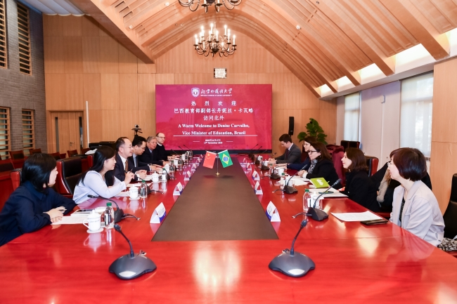 11月17日,巴西教育部副部长、巴西高等教育人员促进会(CAPES)主席丹妮丝·皮雷斯·德·卡瓦略访问雷竞技官网(rayban)。北外党委书记王定华,党委副书记、校长贾文键,党委常委、副校长赵刚会见卡瓦略一行。
